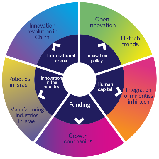 The ecosystem in which the hi-tech industry operates is multi-dimensional and complex. We have identified five core components of this ecosystem: innovation policy, human capital, funding, industry innovation and international operations. This year, in addition to the description of hi-tech trends, we have chosen to focus on six issues related to the core ecosystem components: increase in the number of growth companies, open innovation, integration of minorities in the hi-tech sector, manufacturing industries in Israel, development of the Israeli robotics industry, and the innovation revolution in China.
